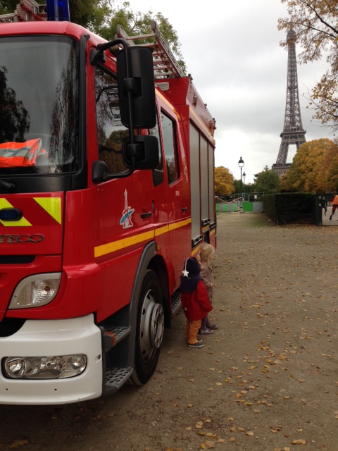 There are some fabulous parking spots across from Ecole Militaire, which is at one end of the long promenade leading up to the Tower. At 9:30 A.M. there isn’t any competition for a spot, so we pull in and before we know it our little man is excitedly pointing out the window. What was he excited about; the Eiffel Tower? No, there were two firetrucks parked on the promenade. Of course! It is Sunday morning and instead of the firemen doing their morning footing (run) in the public park, they are playing a friendly game of soccer. So in lieu of walking toward the Tower, we checked out the firetrucks. IMG_3777This is what it means to be two years old and live in Paris, right? After my husband and I took the obligatory selfie with the Eiffel Tower (and the soccer-playing firefighters) in the background we made our way to church.
